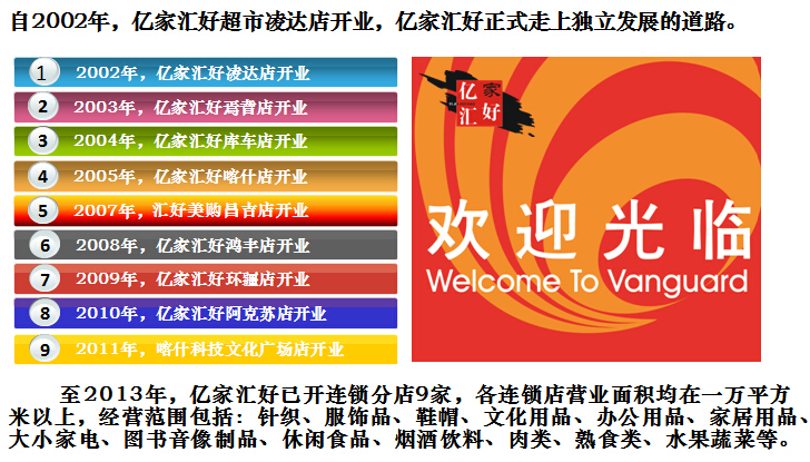 億家匯好商貿(mào)有限責(zé)任公司于2002年成立,并從臺(tái)灣引進(jìn)連鎖經(jīng)營(yíng)職業(yè)管理團(tuán)隊(duì),統(tǒng)一管理旗下各地的連鎖超市。公司通過多年的穩(wěn)健發(fā)展,至2013年底,億家匯好商貿(mào)有限責(zé)任公司已成為擁有員工近3000多人,下轄一個(gè)配送中心和9家連鎖超市的大型綜合性零售企業(yè)。總經(jīng)營(yíng)面積11萬多平方米,配送中心輻射公司所有超市,年配送額可達(dá)2億元。公司大量吸納下崗職工,經(jīng)過崗前培訓(xùn),提高勞動(dòng)技能,實(shí)現(xiàn)了他們的再就業(yè),為維護(hù)社會(huì)和諧穩(wěn)定做出了貢獻(xiàn)。2013年,巴州億家匯好商貿(mào)有限責(zé)任公司在自治區(qū)零售業(yè)中穩(wěn)踞前三位,是自治區(qū)重要的流通龍頭企業(yè),2013年年銷售收入達(dá)10億人民幣。多年來,公司一直重管理、抓實(shí)效、運(yùn)用先進(jìn)的管理手段和營(yíng)銷理念,秉承億家匯好人 時(shí)時(shí)尋求效率創(chuàng)新,事事講究專業(yè)技術(shù)的文化精髓,創(chuàng)造了良好的經(jīng)濟(jì)效益和社會(huì)效益。公司先后多次被消費(fèi)者協(xié)會(huì)評(píng)為誠(chéng)信單位,并多年被評(píng)為重合同,守信用單位。